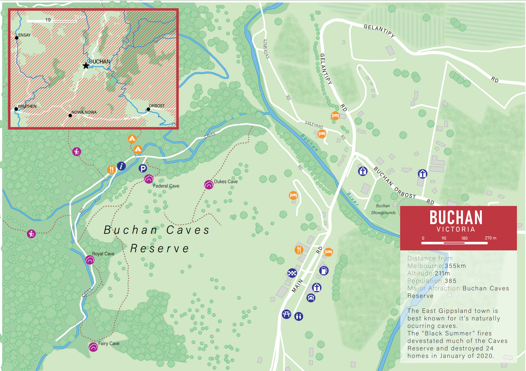 These fires had huge impacts on many rural towns throughout Australia. Below is a map of Buchan, highlighting the reasons that Buchan is more than