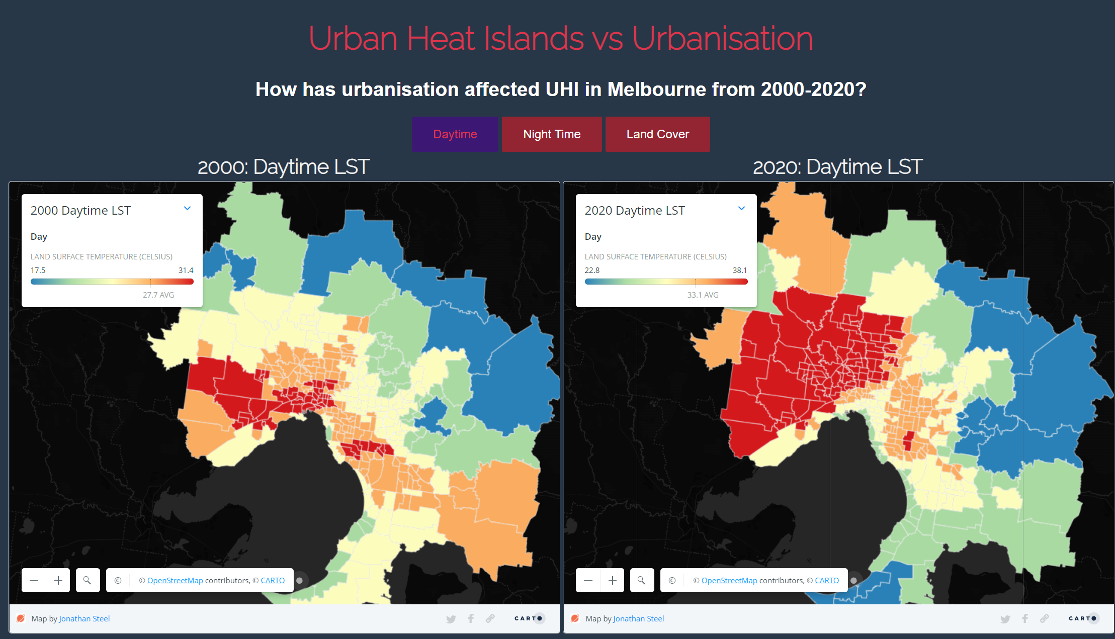 A more deatiled look at the land surface temperature of Melbourne can be observed from the interactive maps below. These maps formed part of a an interactive website (see below image).
